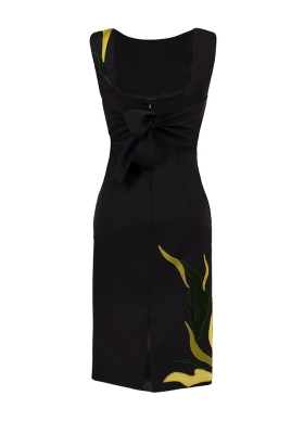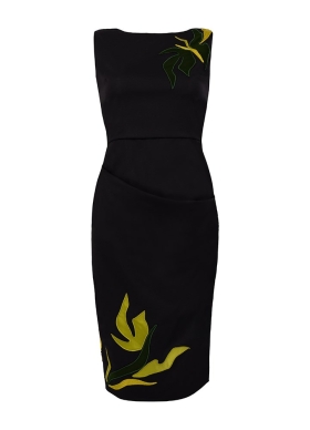 Rochie midi neagra cambrata din lana cu broderie verde si funda la spate Donna