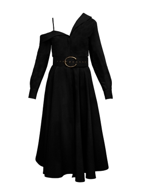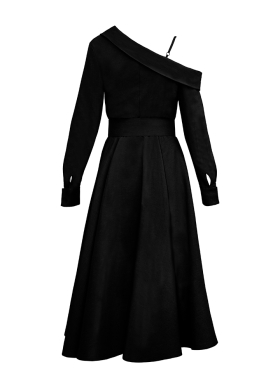 Rochie midi neagra evazata si decolteu pe umar Seine din vascoza si in
