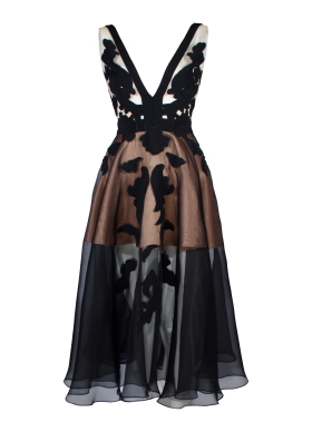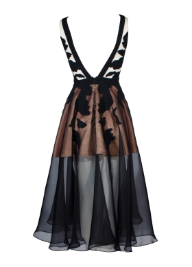 Rochie midi negru si bej din organza de matase cu decolteu in V si broderie Fado