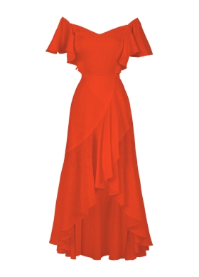 Rochie midi portocalie asimetrica cu volane si fusta petrecuta Thalia