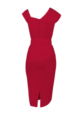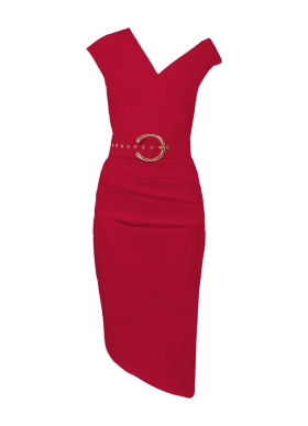 Rochie midi rosie cu decolteu asimetric si fusta cu drapaje Razz