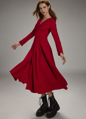 Rochie midi rosie cu fusta ampla si drapaje Guernica
