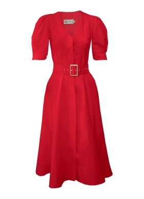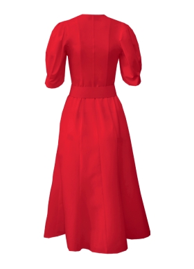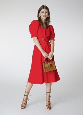 Rochie midi rosie evazata cu maneci ample si curea asortata Bell