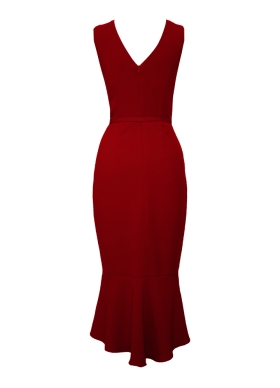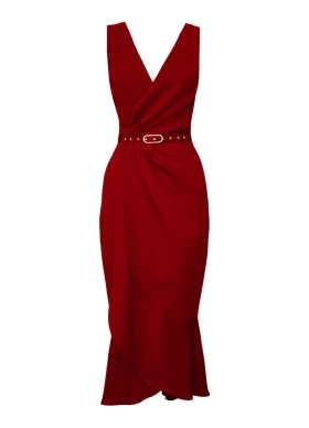 Rochie midi rosu inchis cu decolteu in V si curea asortata Fame