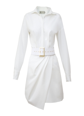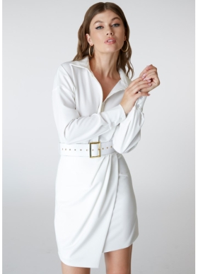 Rochie mini camasa alba cu curea asortata si fusta asimetrica Chemise