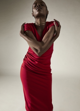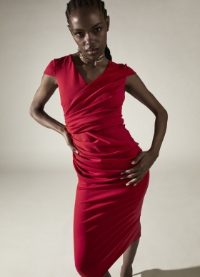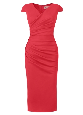 Rochie rosie bodycon midi model office drapat cu decolteu in V Cara