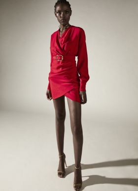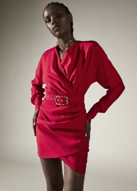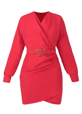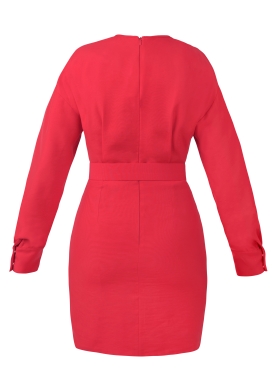 Rochie rosie scurta din vascoza cu maneca de camasa decolteu in V si fusta petrecuta Rondo