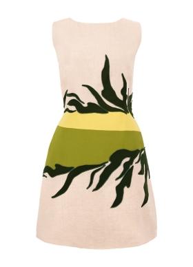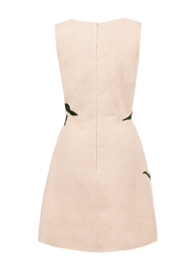 Rochie scurta bej din in cu croiala in A si broderii Gaia