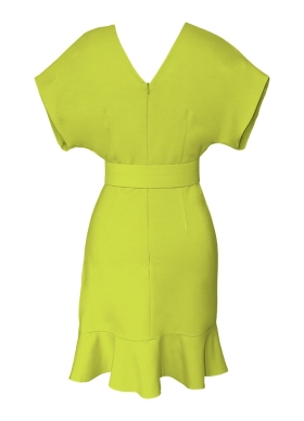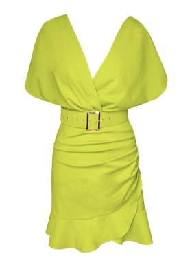 Rochie scurta lime din vascoza cu decolteu in V si fusta cu volan Mariposa