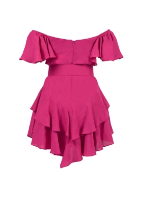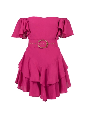 Rochie scurta magenta din in cu volane si curea asortata Samba