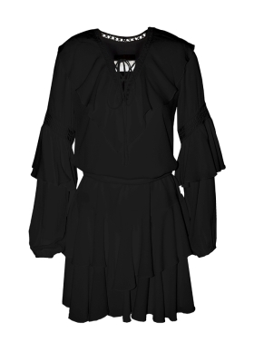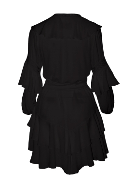 Rochie scurta neagra din vascoza cu detalii crosetate si fusta cu volane Malaga