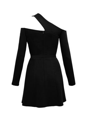Rochie scurta neagra din vascoza cu top asimetric si maneci lungi Bonnie
