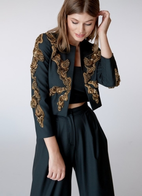 Sacou cocktail scurt kaki din lana cu broderii Magna