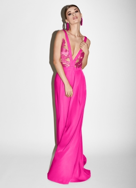 Salopeta cocktail lunga roz din satin cu pantalon evazat si decolteu in V cu broderii Fever